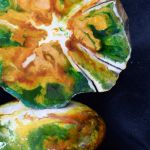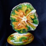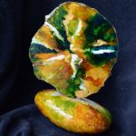 Tranche de bois peinte des deux côtés sur galet peint, format 20/13/10 cm environ.
