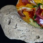 Installation de galet brut et tranche de bois peint d'un seul côté, laissant le bois brut poli sur le verso. Format 20/13/10 cm environ.