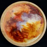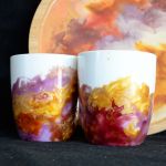 Ensemble assiette peinte (en bambou, diamètre 24 cm, recouverte de résine alimentaire), accompagné de deux tasses en porcelaine peintes.