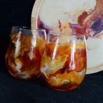 Ensemble composé d'une assiette en bambou (diamèttre 24 cm, peinte à l'acrylique et protégée d'un revêtement alimentaire), et de deux verres peints.
